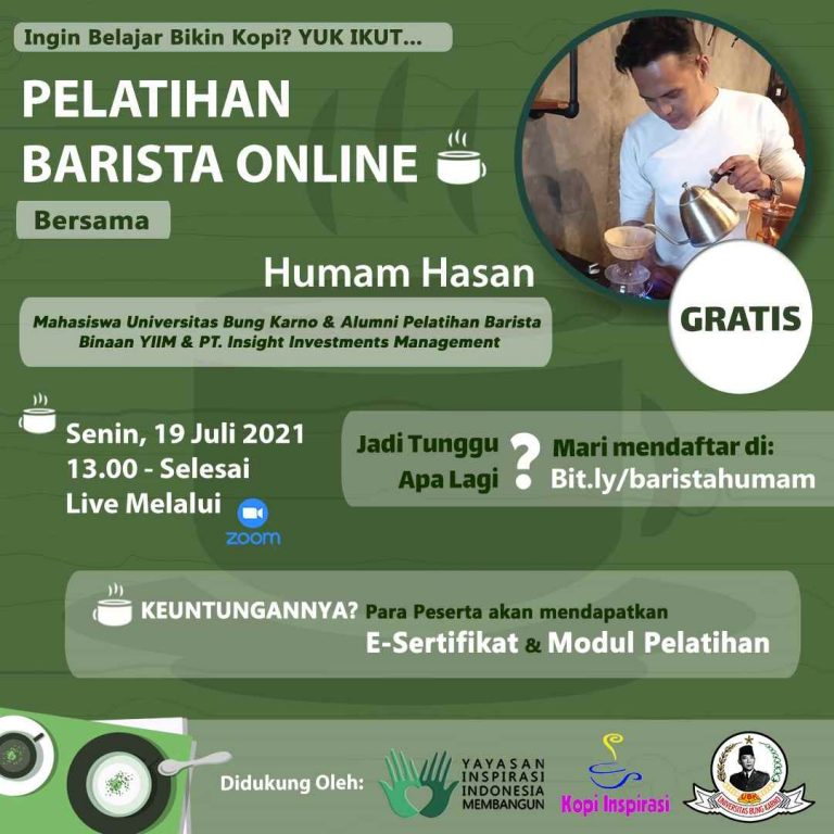 Yayasan Inspirasi Indonesia Membangun (YIIM) bersama HUMAM HASAN, alumni kelas kewirausahaan barista kopi yang diselenggarakan oleh YIIM dan PT. Insight Investments Management (INSIGHT), akan menyelenggarakan pelatihan barista online untuk pemuda dan mahasiswa terdampak Covid 19.