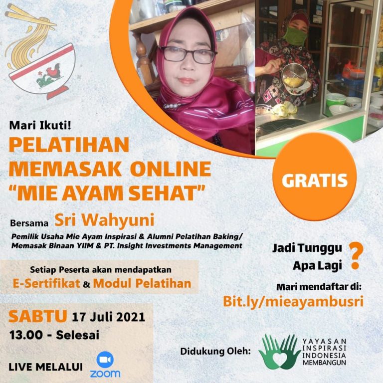 Yayasan Inspirasi Indonesia Membangun (YIIM) bersama ibu Sri Wahyuni, alumni kelas kewirausahaan kuliner (Baking Class) akan menyelenggarakan pelatihan kuliner dengan menu pelatihan Mie Ayam Sehat tanpa pengawet.