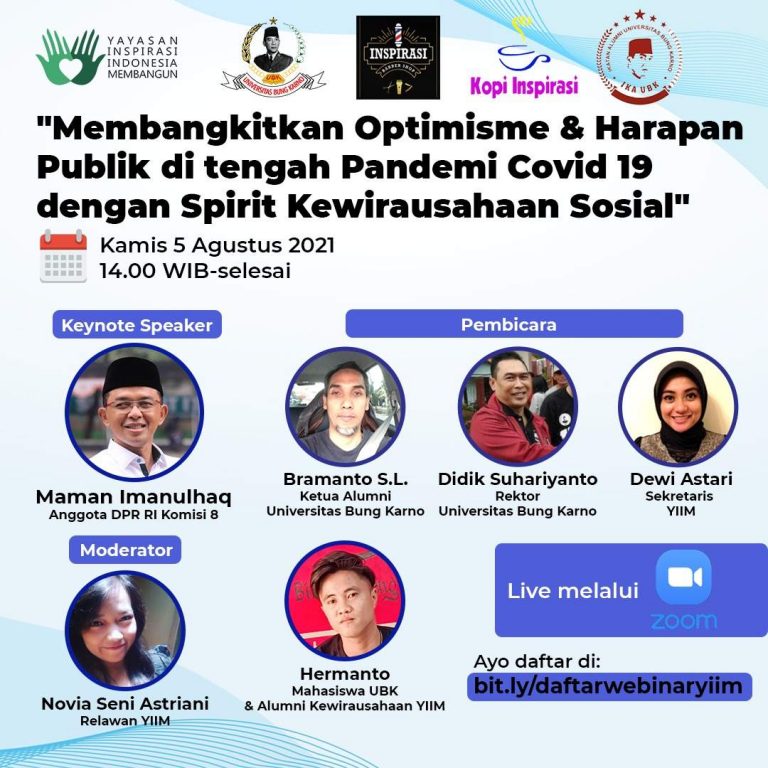Pada tanggal 5 Agustus 2021, Yayasan Inspirasi Indonesia Membangun (YIIM) bekerjasama dengan Civitas Akademika Universitas Bung Karno (UBK) dan Keluarga Besar Alumni Kampus Bung Karno (KAMI UBK dikenal juga sebagai IKA UBK), menyelenggarakan Webinar dengan tema “Membangkitkan Optimisme dan Harapan Publik Ditengah Pandemi Covid – 19 dengan Spirit Kewirausahaan Sosial”.