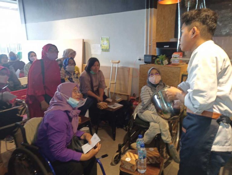 During the event, participants were very interactive and also asked many questions directly to Chef Dhimas. Mrs. Siti Hodijah is one of the participants with a deafness, asked the Chef how to make the dimsum skin last longer. This shows the enthusiasm of Mrs. Siti, although with her limitations, it does not hinder her enthusiasm to learn in the cooking training held by YIIM and INSIGHT. To give rewards to participants who actively ask questions and participate in the training, participants are given goodie bags containing dimsum raw materials and cheese sticks that participants can practice at home.