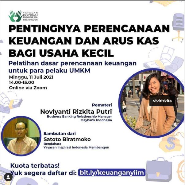 Dalam rangka memastikan para alumni pelatihan kewirausahaan yang pernah mengikuti kelas kewirausahaan yang diselenggarakan oleh Yayasan Inspirasi Indonesia Membangun (YIIM) dan PT. Insight Investments Management (INSIGHT) dapat menjalankan bisnis mereka dengan baik, YIIM kembali menyelenggarakan pelatihan perencanaan keuangan terbatas dengan tema “Pentingnya Perencanaan Keuangan dan Arus Kas Bagi Usaha Kecil” pada tanggal 25 Juli 2021 secara online (daring).